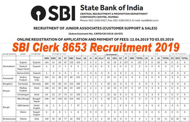 State Bank of India (SBI) published Bank Jobs an official notification for Recruitment of Clerk / Junior Associate (Customer Support & Sales) for 8653 posts at www.sbi.co.in. Eligible candidates can apply online for this recruitment read full jobs notification and check given below details.SBI Clerk 8653 Recruitment 2019